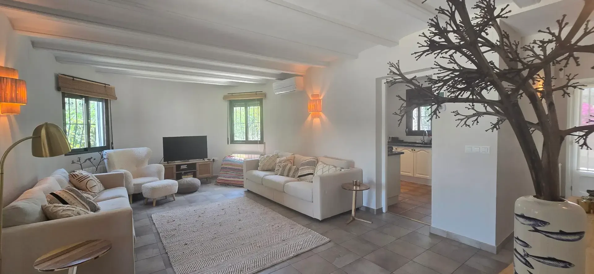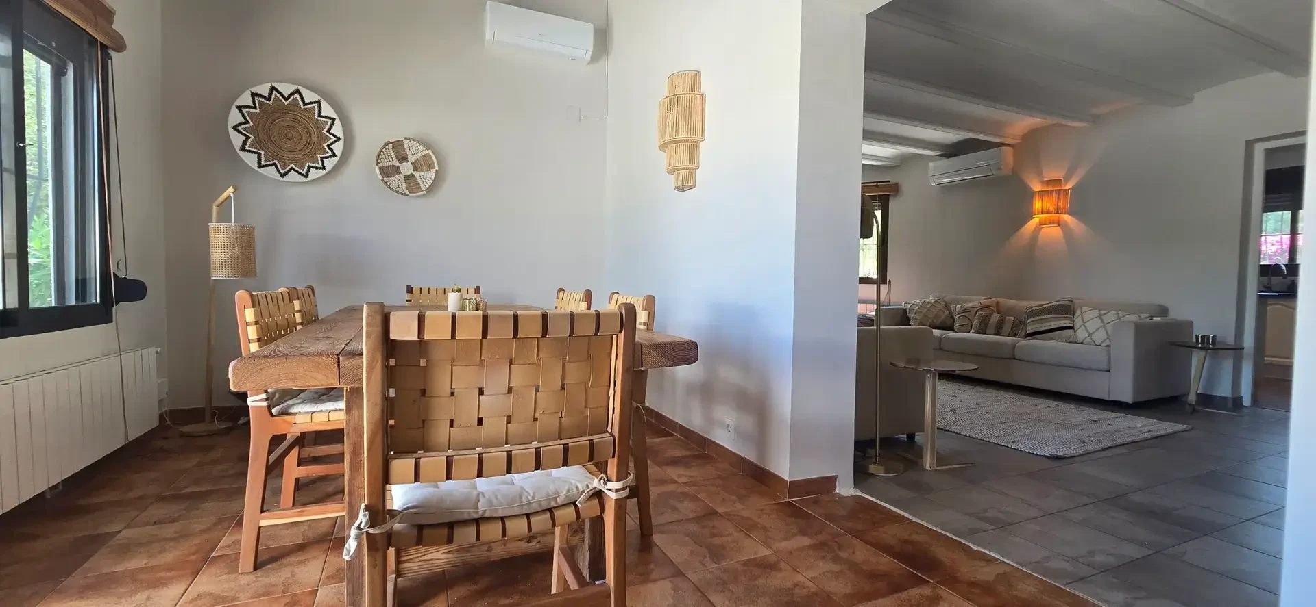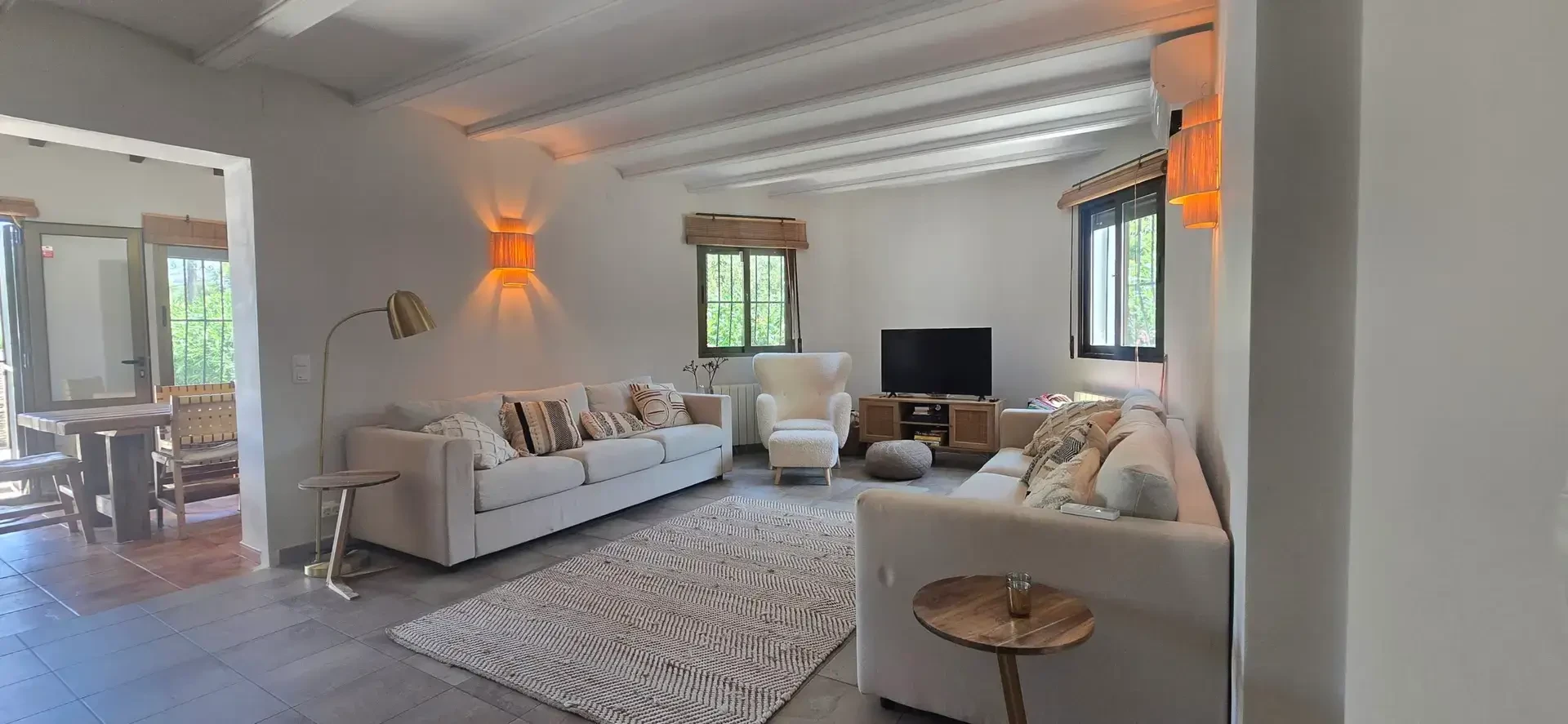 Stap binnen in onze ruime en sfeervol ingerichte villa, waar comfort en stijl samenkomen. De lichte woonkamer is de perfecte plek om te ontspannen na een dag vol avontuur. Geniet van de comfortabele meubels en de warme sfeer, terwijl u uitkijkt op het privézwembad en de weelderige tuin.